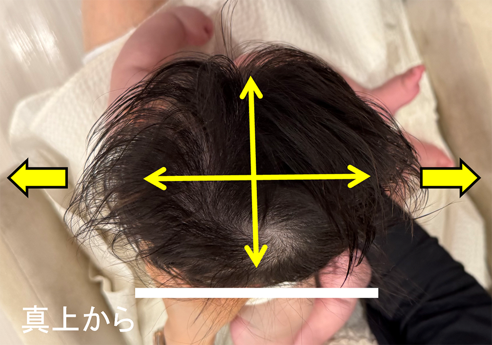 斜頭症は耳の位置のずれ、短頭症は頭の横幅がポイントです