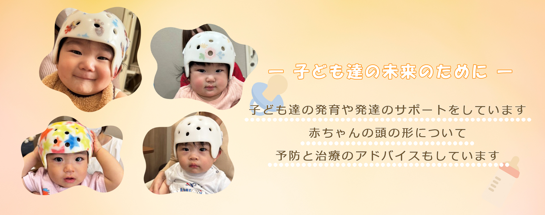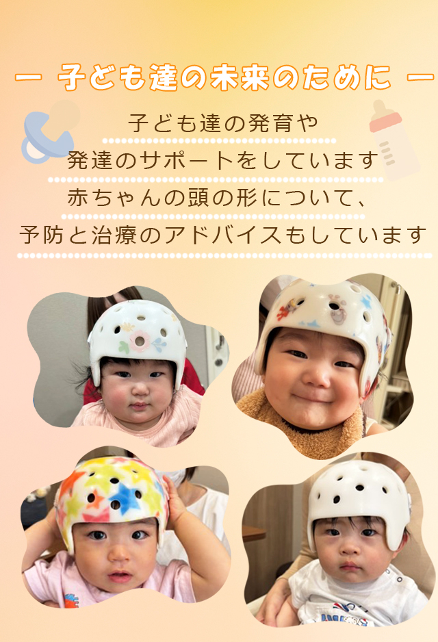 成長の中で気になる“頭の形”を専門的に評価し、栄養指導や生活指導を行いながら、ご希望に応じて3Dスキャンや矯正用ヘルメット治療(ReMO baby)を用いた治療を行っています。単に形を整えるだけでなく、発達や育児の視点から赤ちゃんを総合的にサポートしています。