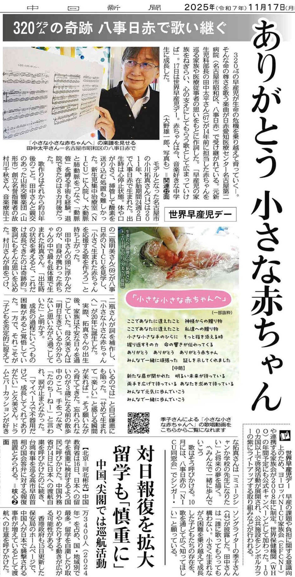 2024年からNICU同窓会が再開され、そこでも歌い継がれていきましたが、2025年11月14日の世界早産児デーに合わせて、中日新聞・東京新聞の1面でこの歌について紹介していただきました。