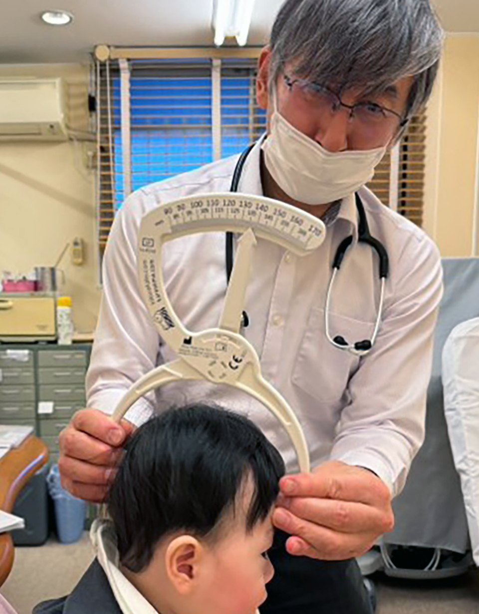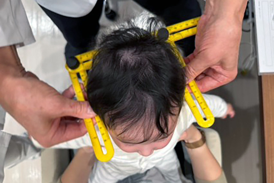 まず、全身の診察を行い、発育発達・神経学的評価もした上で、頭の形をクラニオメーターで計測します。